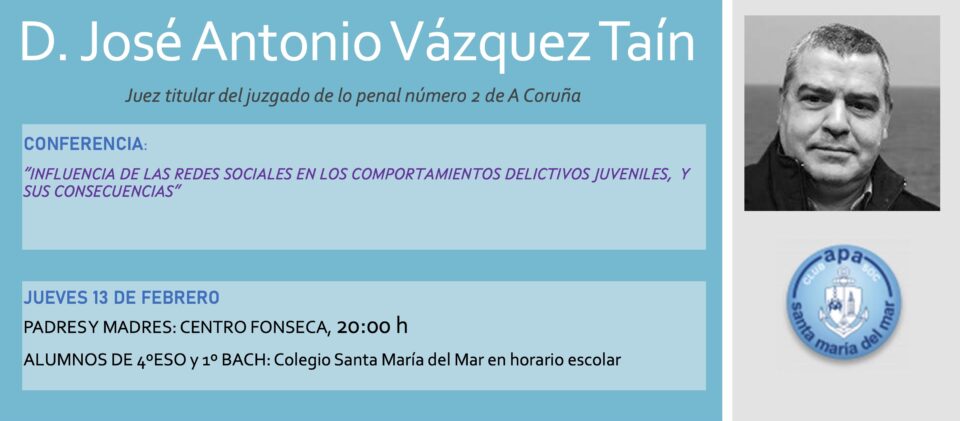 Os invitamos a participar en la charla que impartirá el Juez Taín el día 13 de febrero a las 20:00h en el Centro Fonseca: